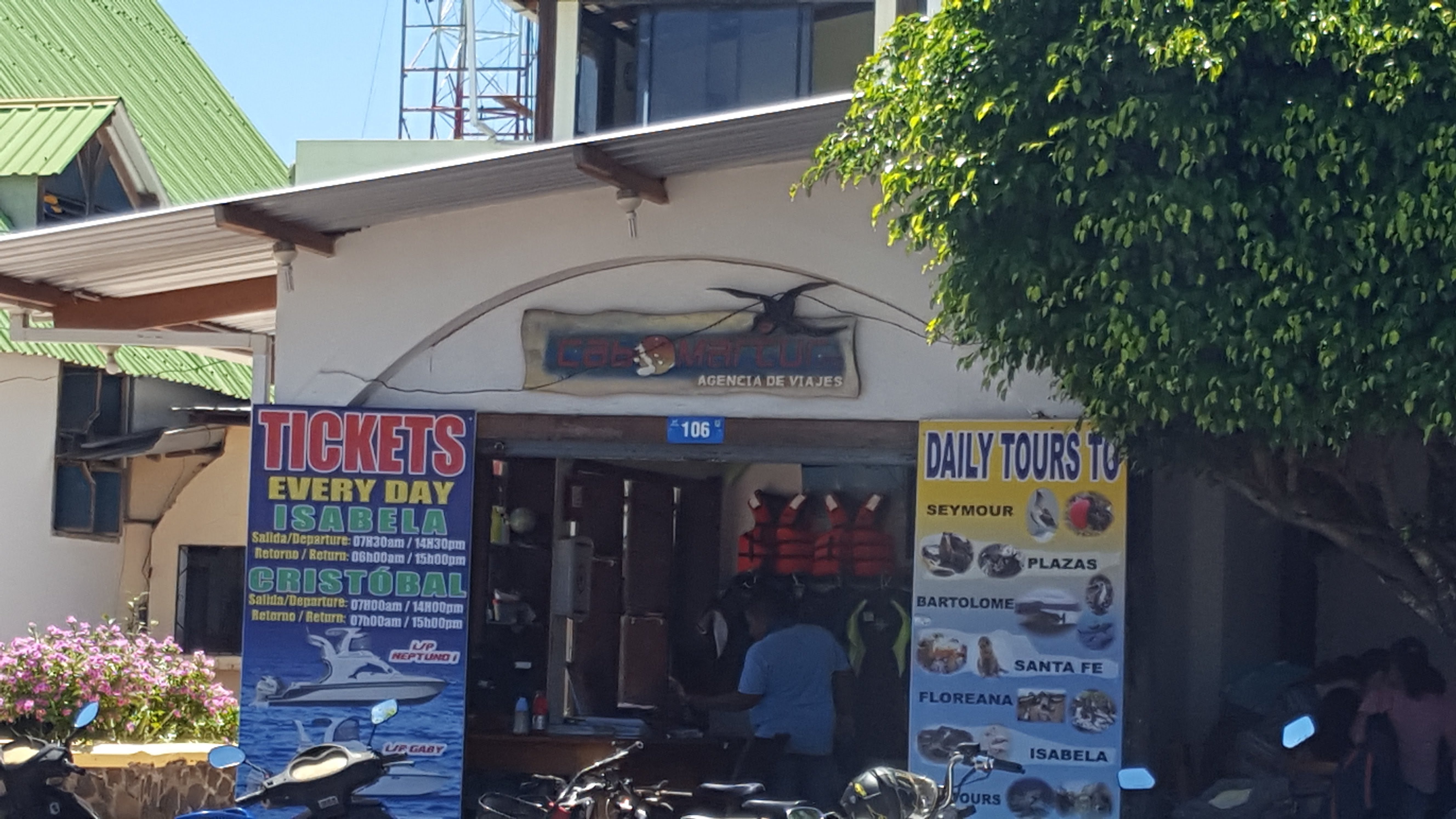 I recommend getting tickets at least a day ahead. We went to a travel agency called Cabo Marcur Agencia de Viajes that was directly across from the pier, which was very convenient as you need to go to the agency before you board the ferry on the day of departure. We got round-trip tickets, $30 per person from Santa Cruz to Isabela, and $25 per person from Isabela to Santa Cruz. Most ferries leave at either 7am or 2pm. I recommend arriving 30-45 minutes before departure as you need to go to the agency, get your ticket, and then go to a crowded pier and have your bags inspected.