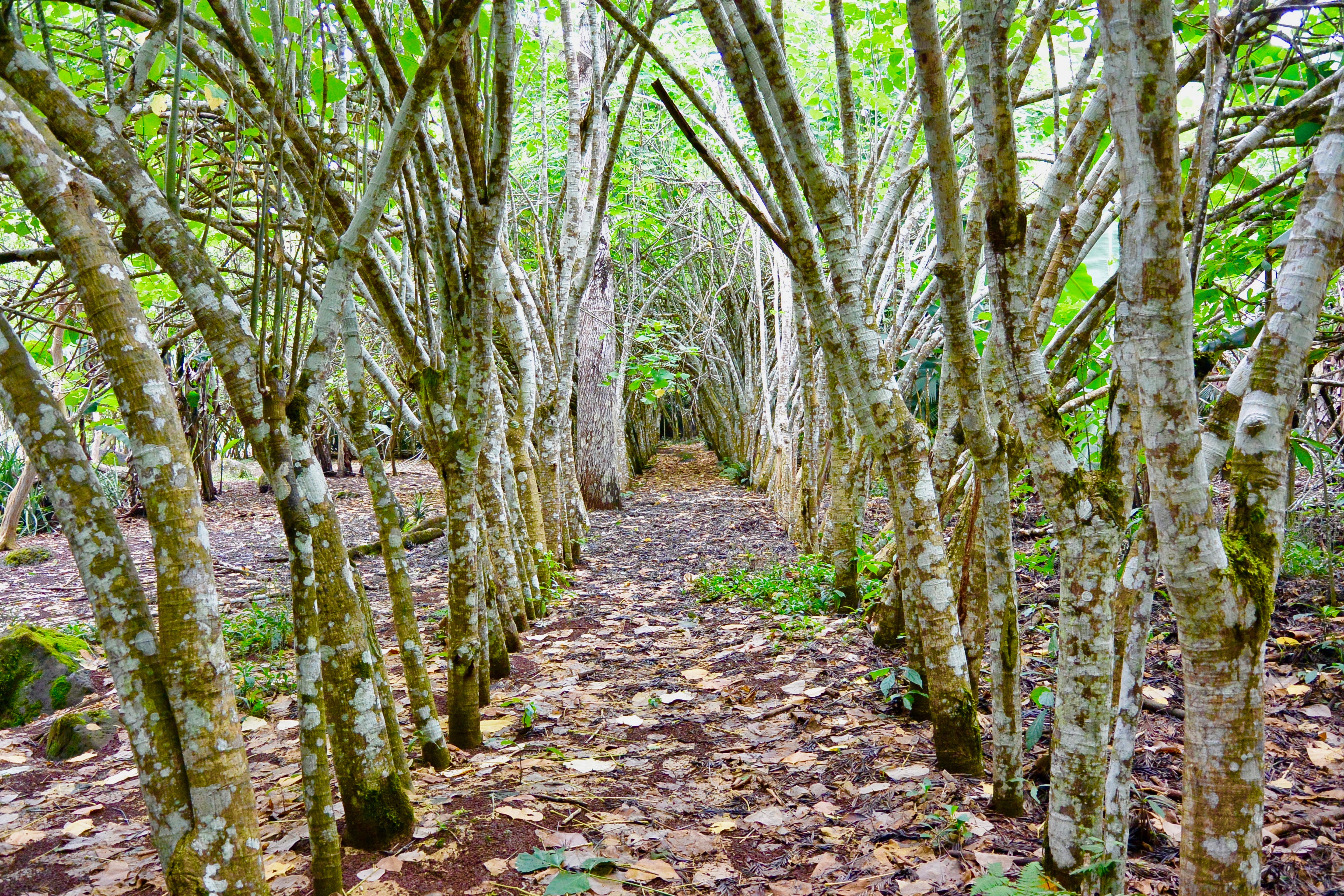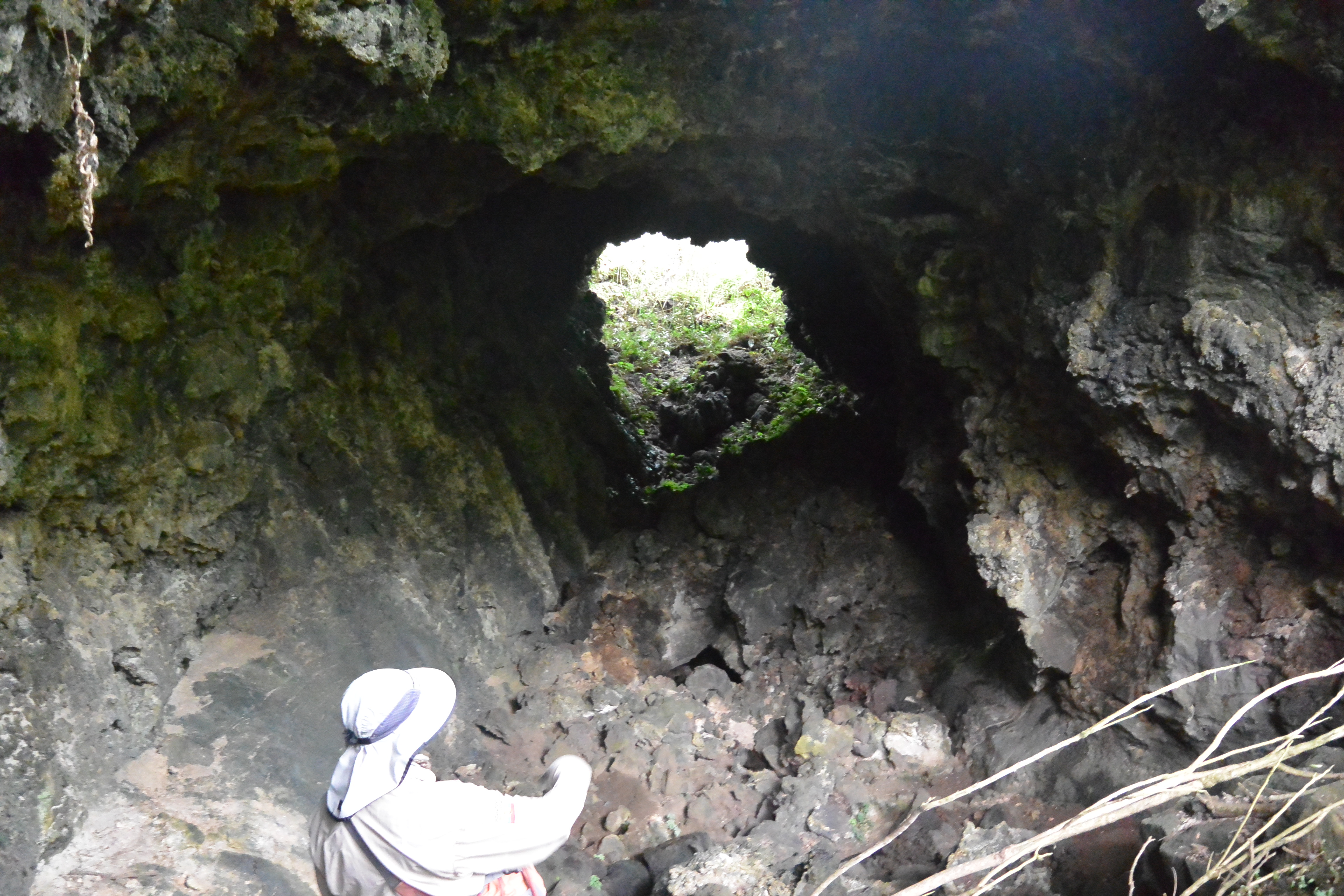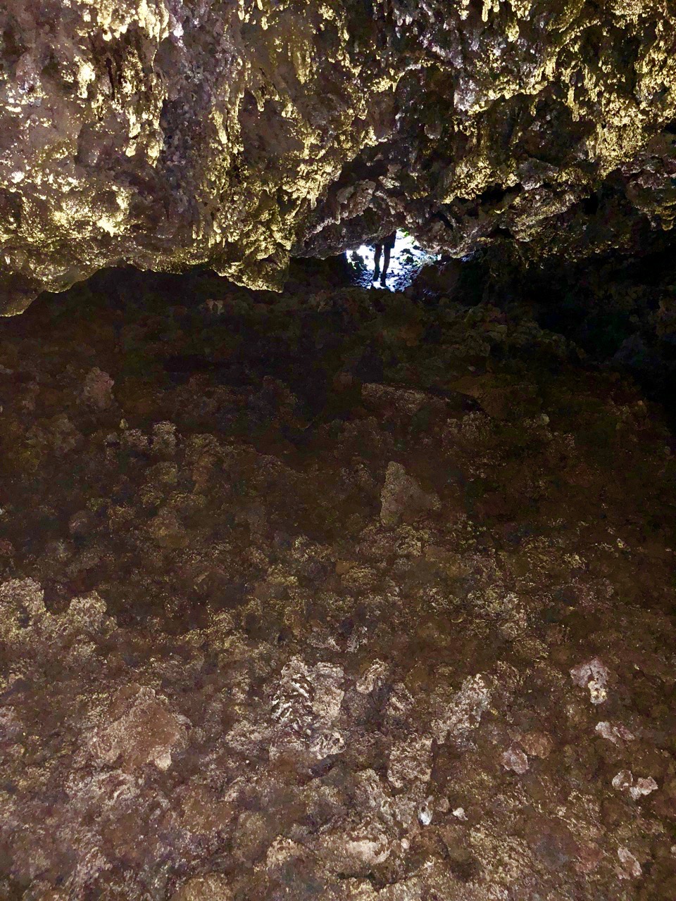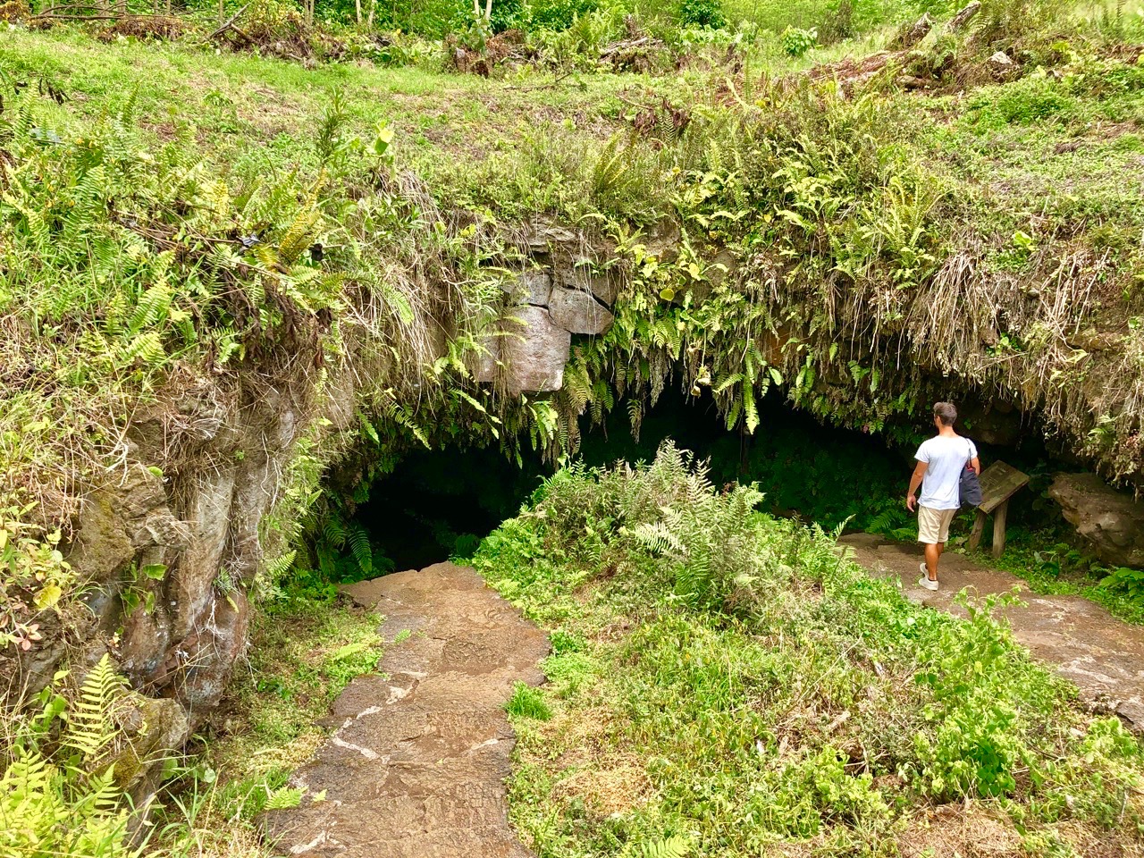 After the hike we went to the lava tunnels. We drove a couple of miles from the volcano to a grassy site with agriculture and trees. We happened upon a subterranean cover that looked enchanted. It was covered with leaves and moisture. This is where you will need your flashlight. It’s very dark down there and using a phone flashlight only gets you so far. It only lit up enough to see where I was walking. The tunnel was filled with a luminescent glow on the walls of the cave, which you can see when you shine your flash light on it. The tunnels are a good height for walking but there are some ducking spots so beware.