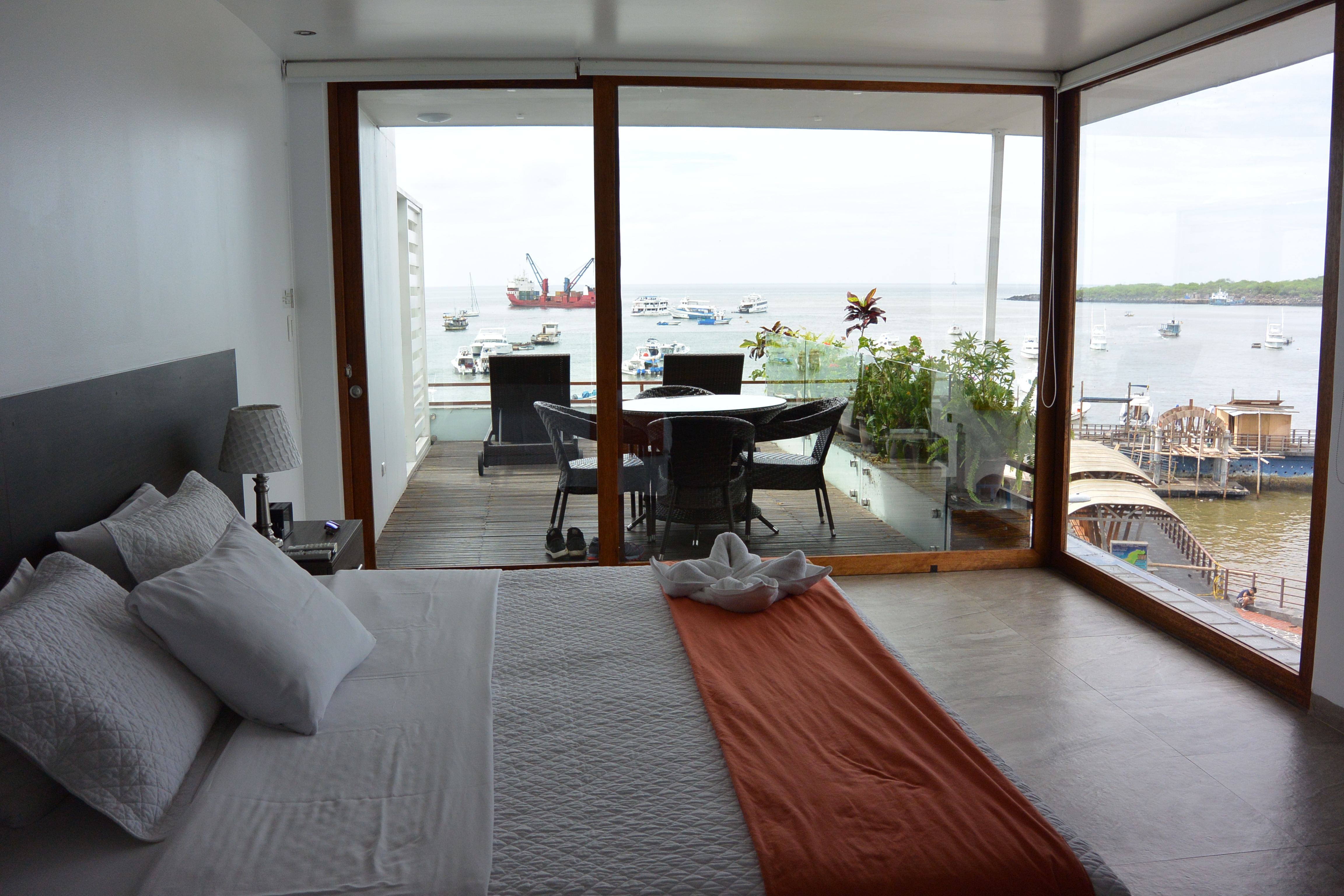 We spent about 3 days on San Cristobal. We stayed at the Galapagos Sunset Hotel, an excellent hotel with a warm, welcoming staff and rooms right on the harbor of Puerto Baquerizo Moreno. You can go out on your balcony and hear the sea lions barking and also walk right across the street and pay them a visit. Our first days in the Galapagos were very rainy, and our room actually had a small leak, but this was expected since it was monsooning outside that day. The staff fixed the leak right away, but they were so accommodating, they upgraded us to their rooftop suite right away. As you can see from the pictures, it was an incredible room, with breakfast served on your private balcony in the mornings.