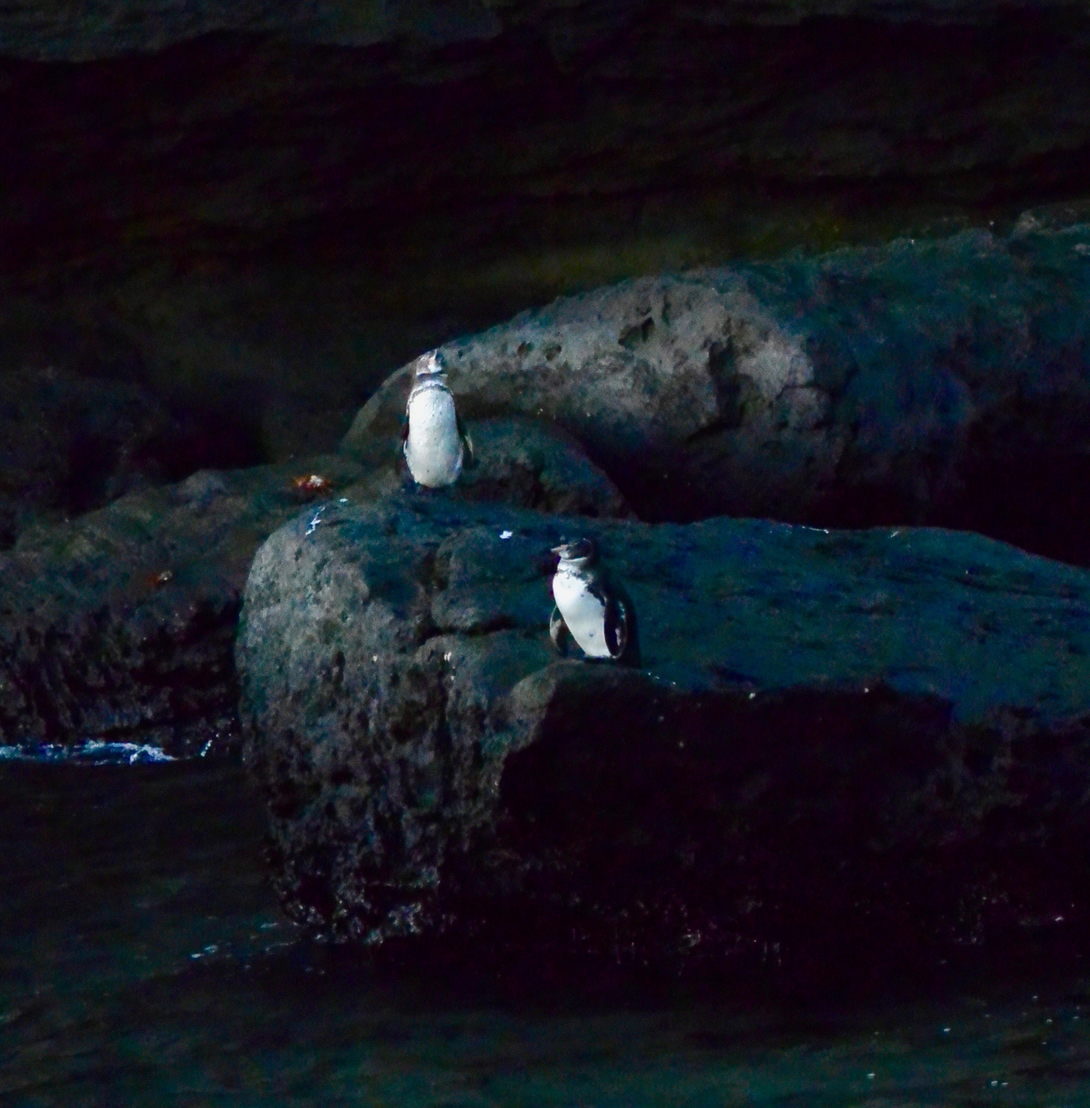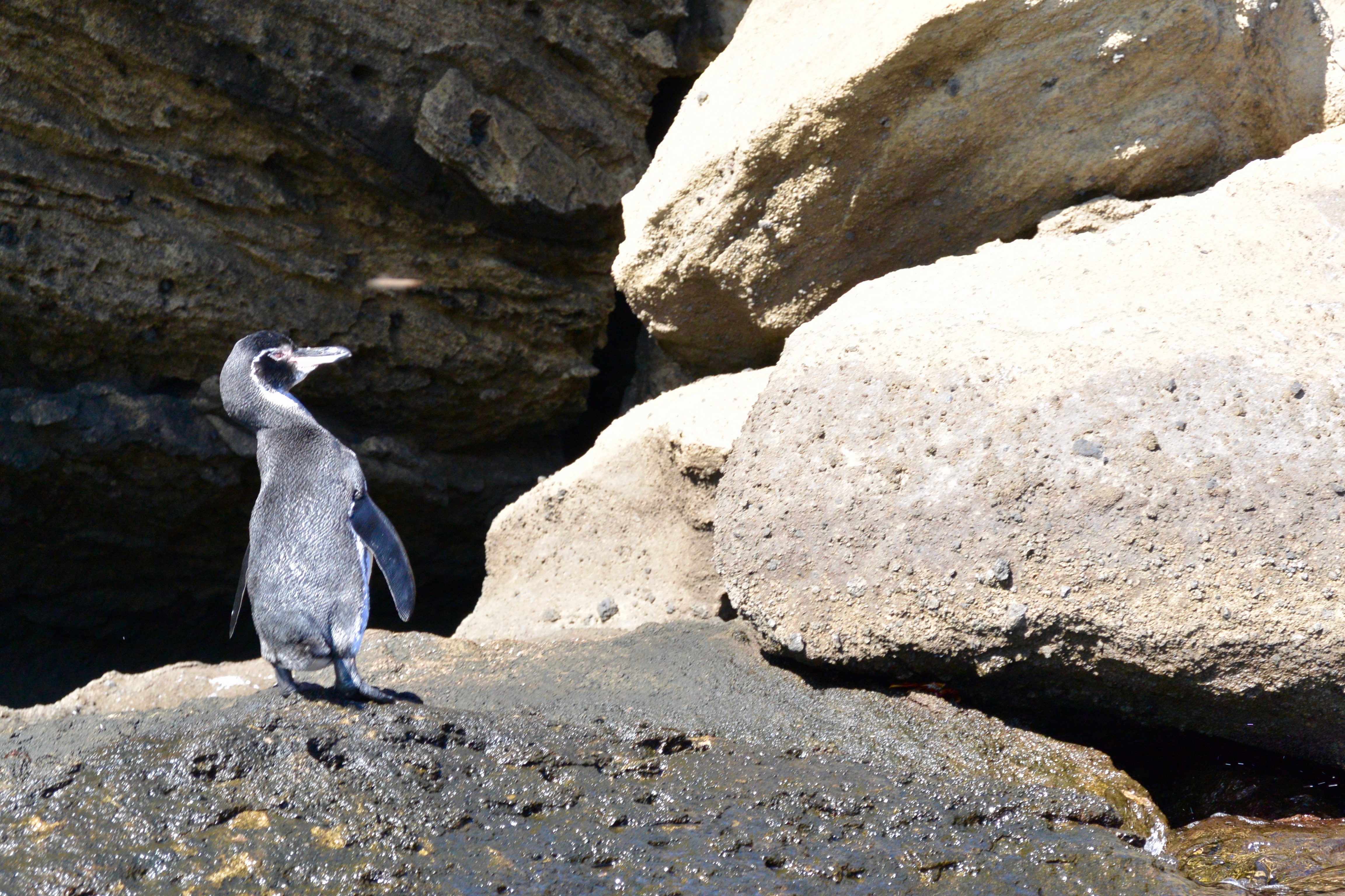 After our hiking we had two amazing snorkeling trips: one off the coast of Rabida and the other on the edge of Bartholomew. We had our first shark sighting near Rabida. I was distracted after sea lions began their synchronized swimming routine in front of me when Anthony grabbed my arm. About 10 feet below us lied a den of white tip sharks that seemed to be sleeping at the sea floor. Contrary to how we typically portray sharks, they did nothing to make us feel unsafe, and this was our continued experience with shark encounters in the Galapagos. Our miraculous sea life sightings continued off the shores of Bartholomew. We got the opportunity to see an octopus slap a fish and then change colors from black to tan as it seemingly disappeared into the sand. Then, David was pointing out some fish to us below the surface when he popped his head above water and yelled, “Penguin!” I immediately raced to the rocks where a small penguin was perched. It began to dance, shaking its tail and drying its feathers. Penguins wound up in the Galapagos a long time ago from the cold tides arriving from the North Pole. They stand at about two-feet tall and are cute as a button.