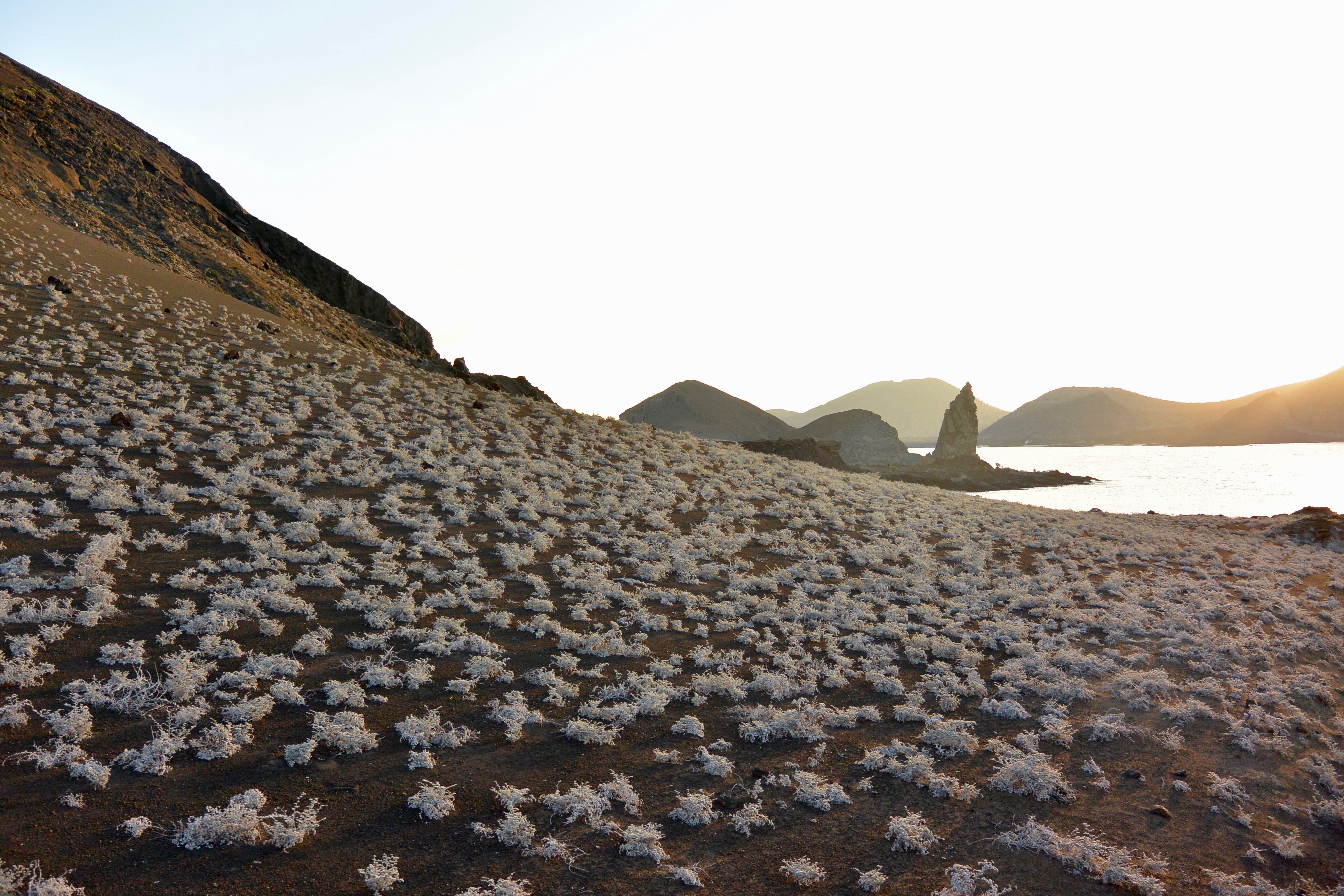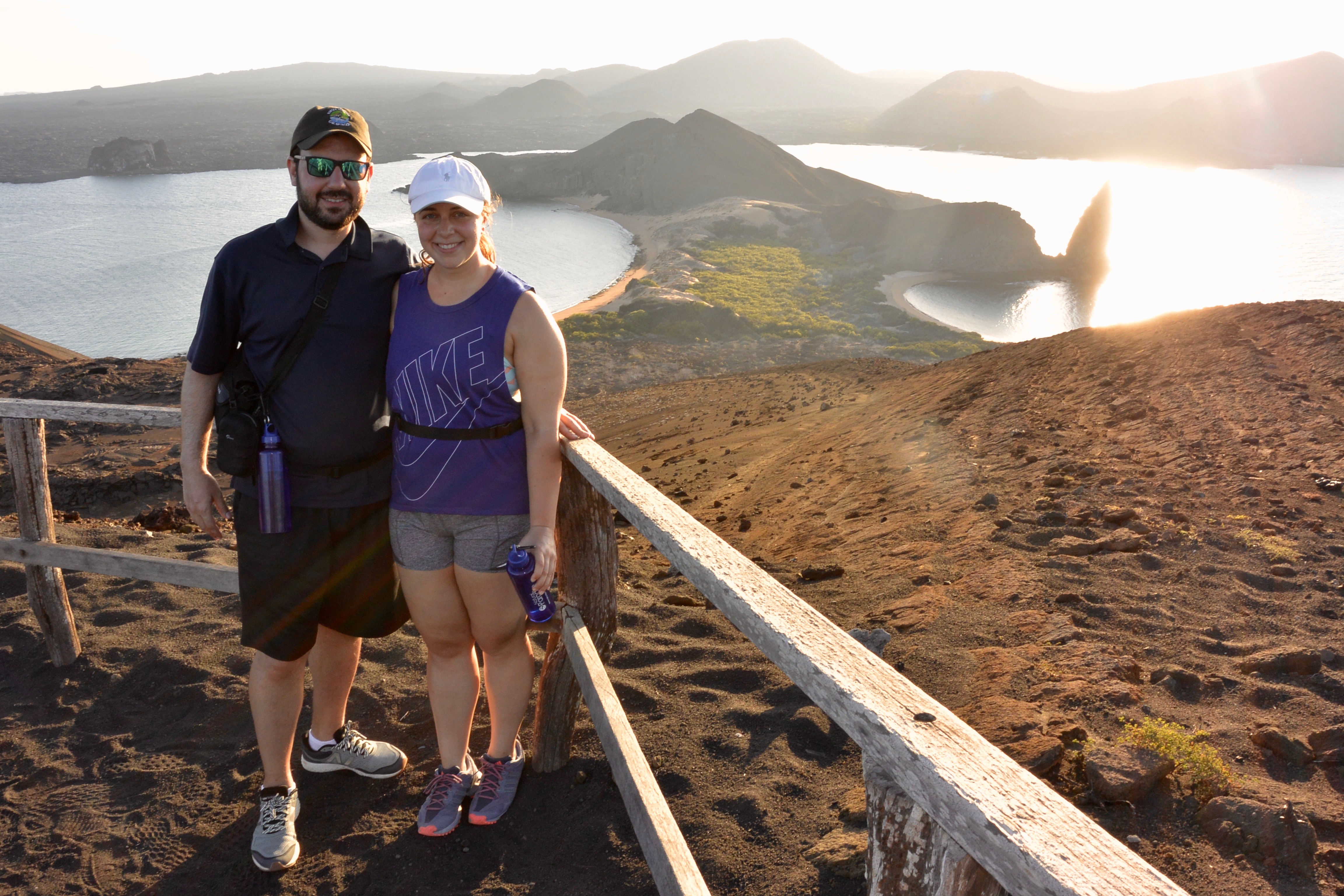 After our excitement underwater, we had some lunch on the boat, relaxed on our balcony, and then got ready for our next hike. When we docked at Bartholomew, we encountered an extraterrestrial landscape. Most of the island consisted of black volcanic soil with sprinklings of unique white plants that looked other-worldly. We began our ascending hike up steep stairs with our first stop to view the underwater caldera, the aftermath of a 19th century volcanic eruption that was said to have killed sailors on boats nearby just from emissions of sulfuric acid. We continued our hike to a highpoint on the island where we had a bird’s eye view of the iconic Pinnacle Rock. We then descended, hopped on the panga, and to our surprise, had another penguin sighting on the way home.