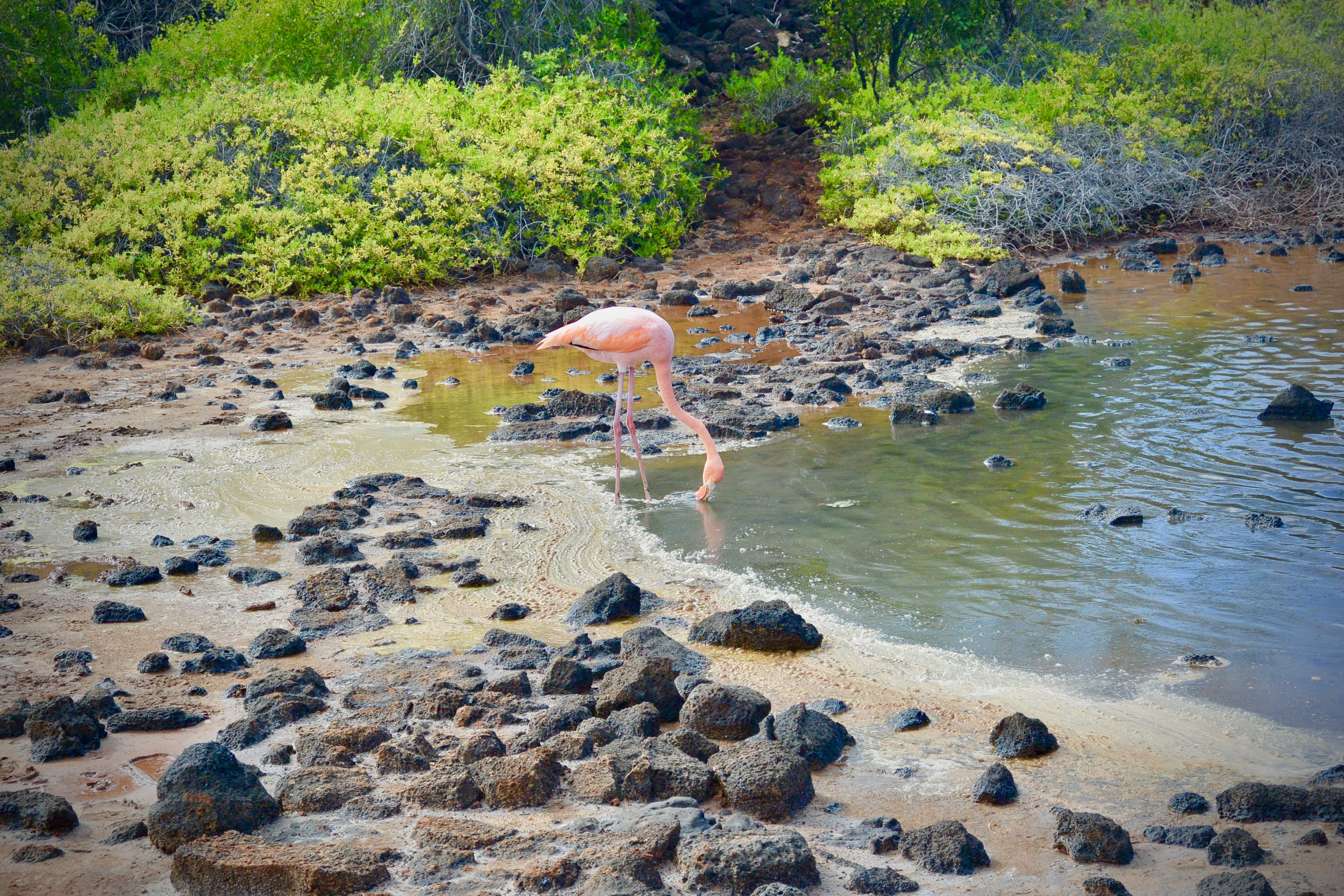 After a short snorkel, we went to Dragon Hill on Santa Cruz Island for our next stop. This was a wet landing, so be prepared for your shoes to get wet. But as you walk along the beach and observe the pink and orange tints of the landscape and the reptilian hill, you’ll forget about your feet. We followed David along the trail and stumbled upon a majestic creature at the beginning and end of our hike. Once I heard the gasps and looked to my left, I saw a pink flamingo, filtering through the water and frolicking in the lagoon. This was one of the highlights of our wildlife sightings but one must not forget the reptiles of Dragon Hill. During our hike, we saw at least 30 iguanas, some as large as a corgi. The hues of the iguanas and ever-expanding Jurassic-esque views of the Dragon Hill made this one of our favorite hikes.