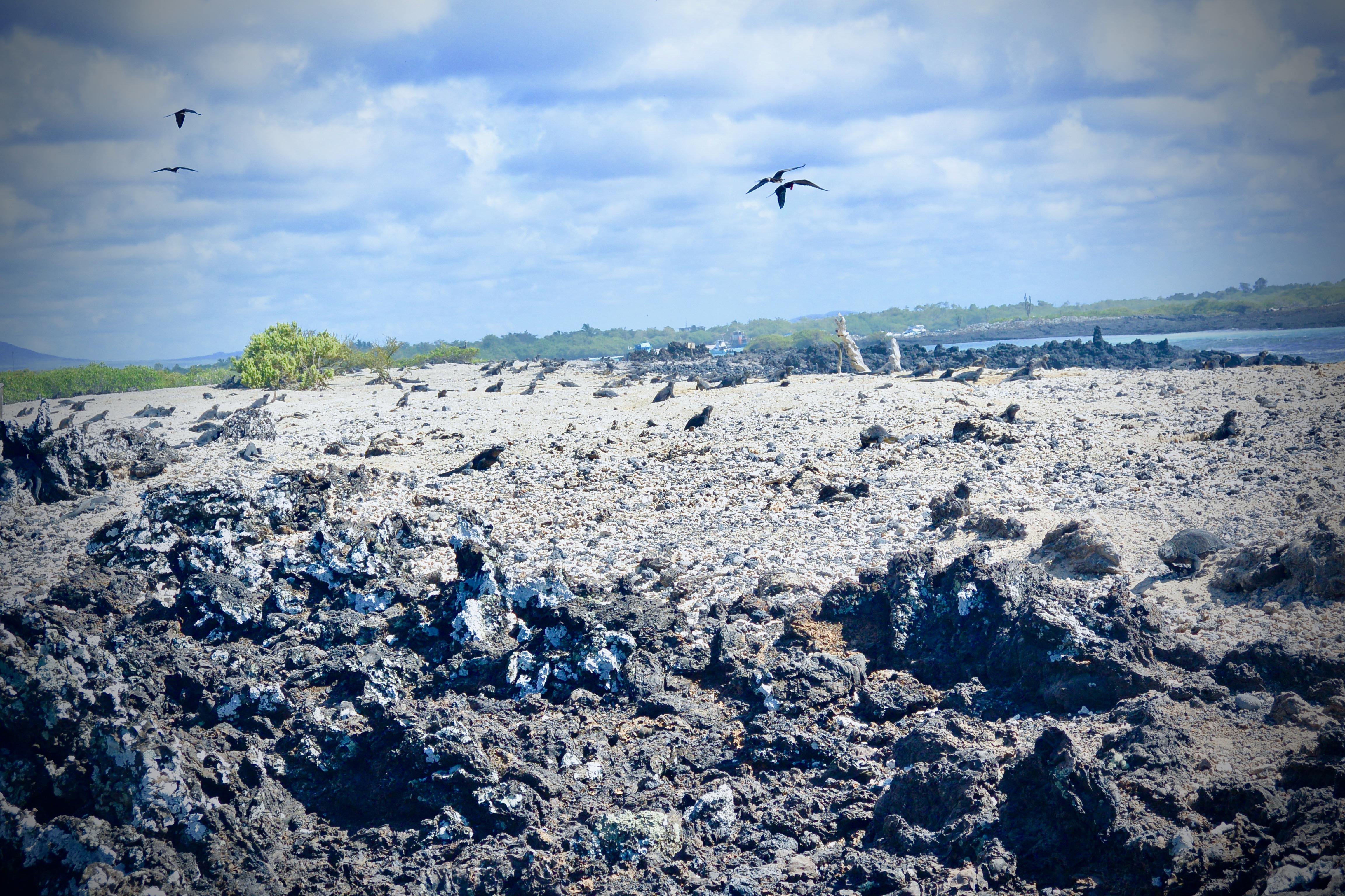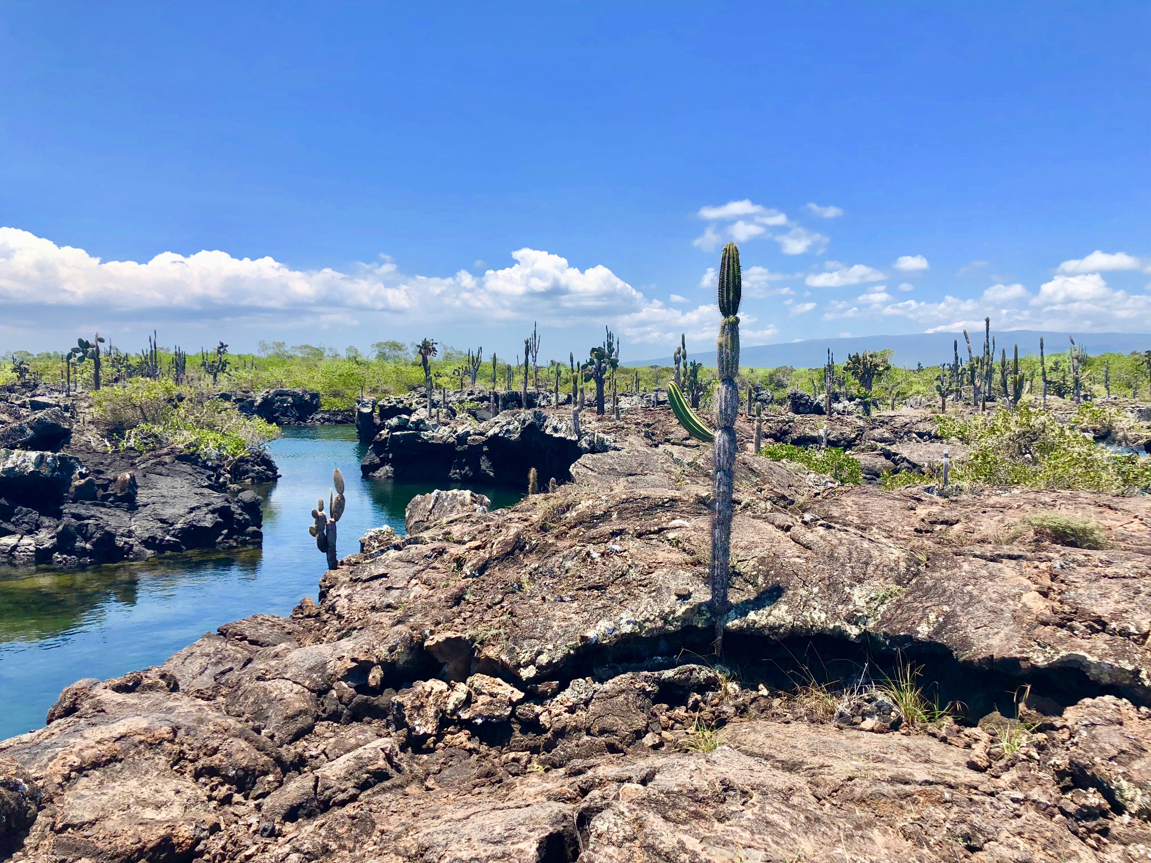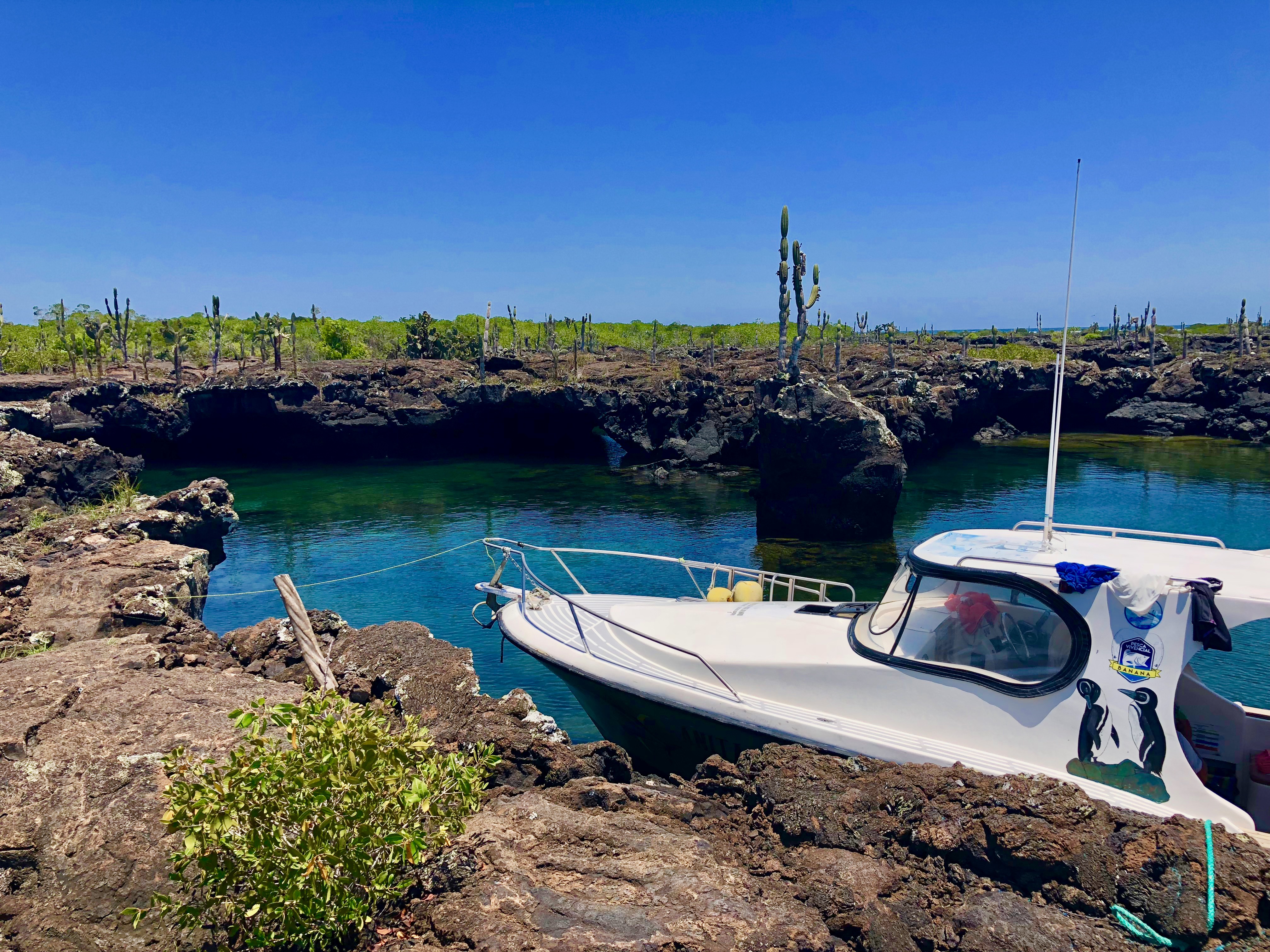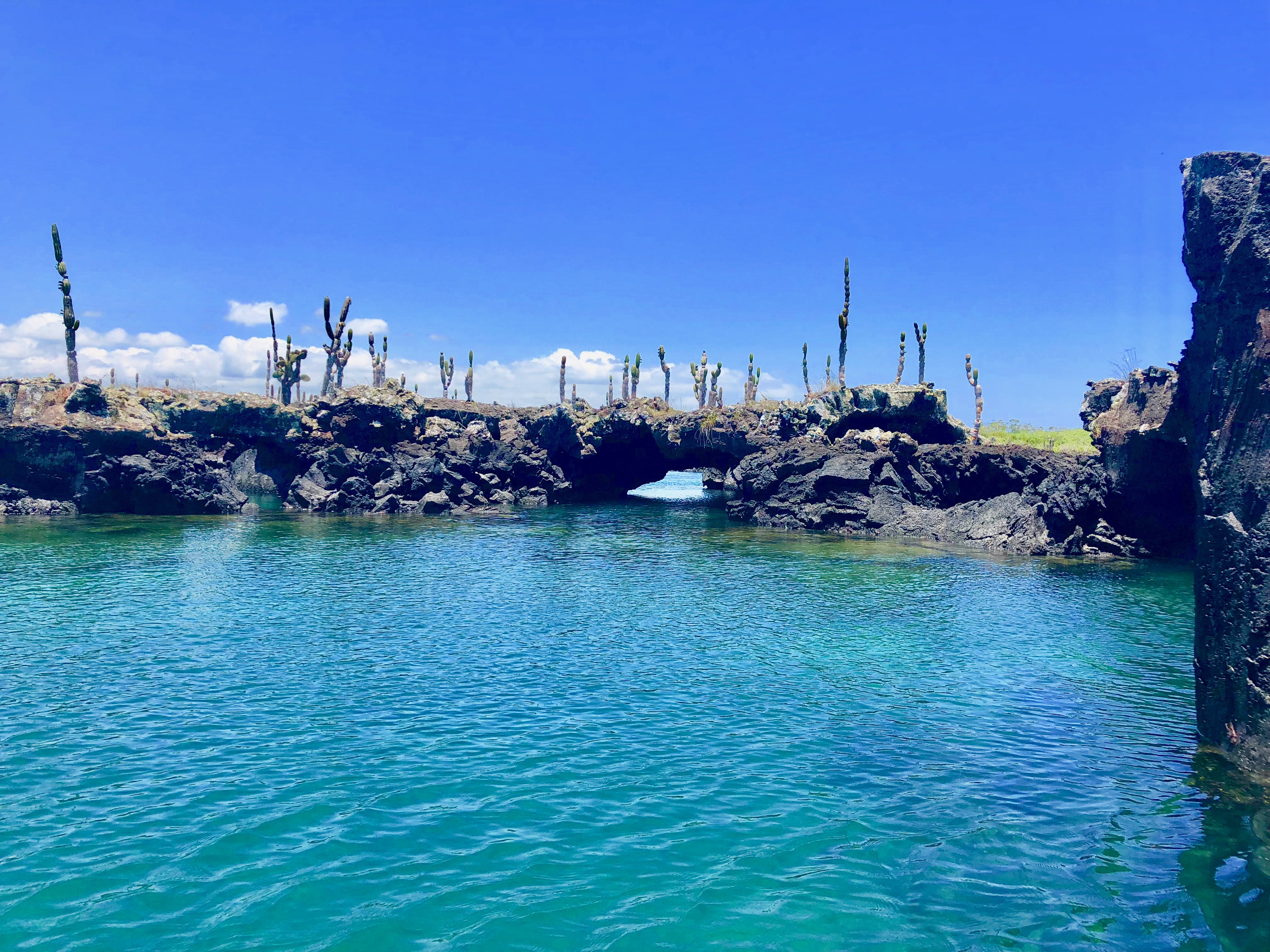 When we arrived at Los Tuneles we were awestruck. Lava tunnels half under and half above water stretched for several miles with cacti and birds settled on top. The captain of our vessel, Joel, navigated his way through the tunnels gracefully, which was no easy feat. This area was tight and shallow and one wrong move would have resulted in boat damage. Our guide, Gabriel, said that Joel has been navigating boats through this area since he was a kid and knows it all too well by now. Joel found a spot to dock the boat and we disembarked to walk along the tunnels.