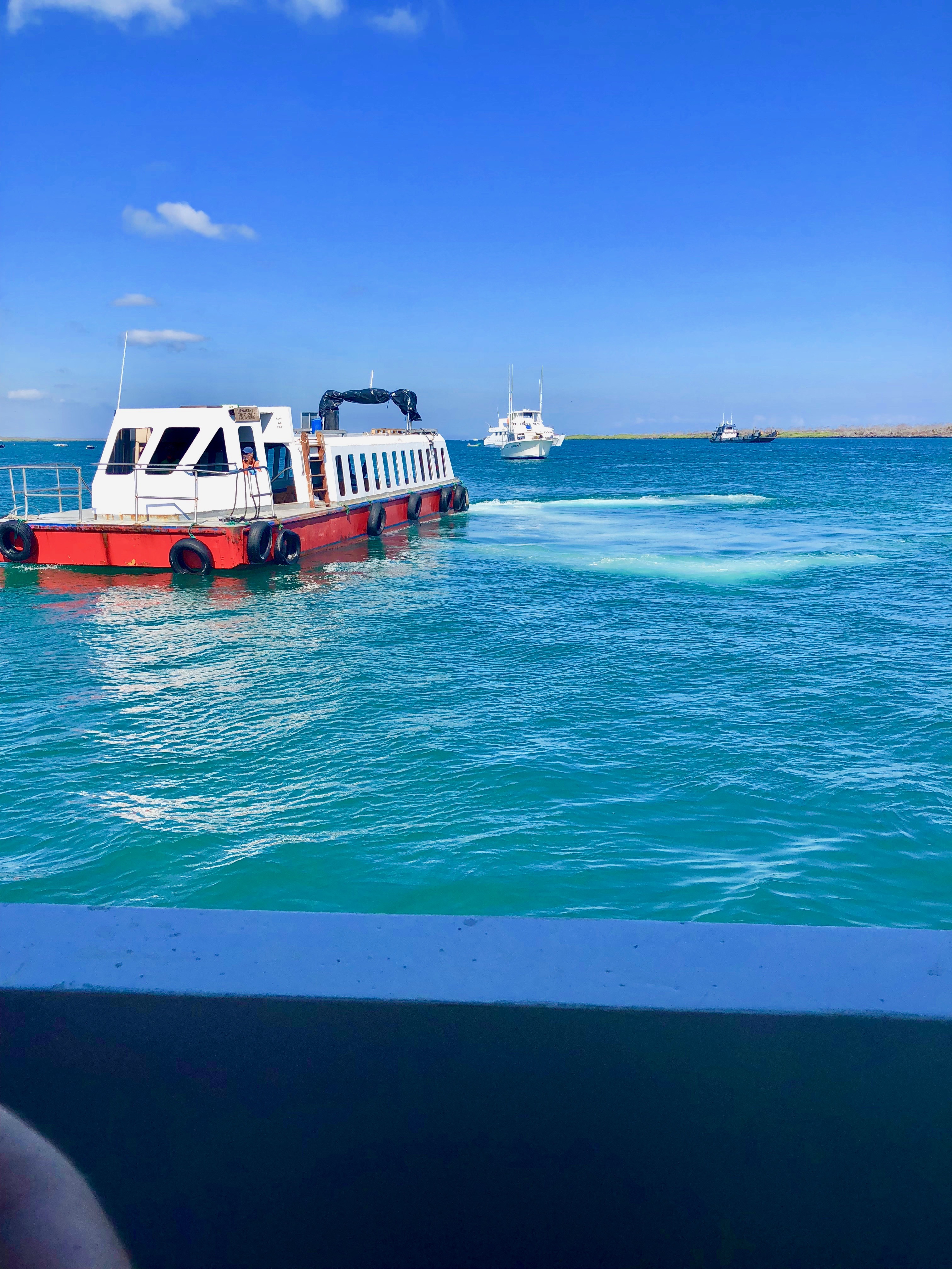 When we arrived at the port, we had to get our bags inspected again and they put a zip tie on the zipper of our bags. This took a few minutes. Then, we had to wait for the captain of our boat to arrive so we could sign his masthead, with our name and passport number, and get our boat name tags, similar to the process at Santa Cruz port. A few feet ahead toward the water, a woman at a table gave us tickets for the water taxi for about $1 each, which was collected on the water taxi. Then we waited on the path for our boat to be called. A bunch of boats come in as the 6am ferries so it’s important to keep an ear out for your boat and get in line once you boat is called. Once you get called, you’ll line up for the water taxi, put your bags on the front and follow the same routine as we did at the Santa Cruz port. The 6am ride was a bit cooler because it was before sunrise with the sun shining at the front of the boat so it was nice and shady.