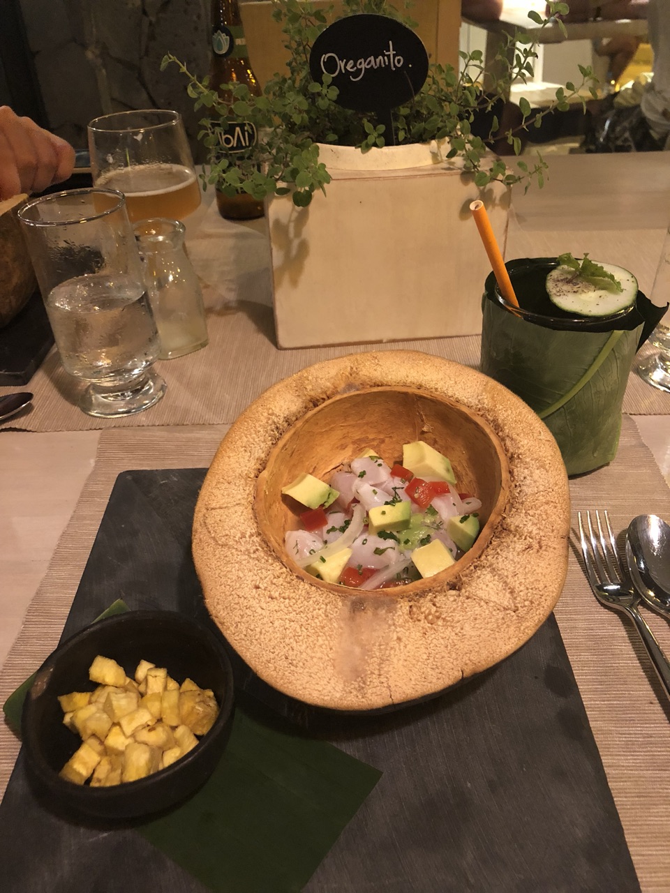 Muyu is a trendy farm, forest, and sea to table restaurant at the Golden Bay Resort just a few minutes away from the main port. Muyu provides a fine dining experience in a casual beachy atmosphere, so no need to dress up. Most of the food including produce, fish, and meat is harvested on the islands, with reduction of their carbon footprint in mind. We ate here twice because the food was delicious. They have an all-encompassing tasting menu, creative cocktails, a nice wine list, and local Ecuadoran craft beers. Try the Savai IPA from Quito!